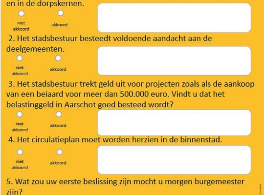 Hoe zou u zelf Aarschot besturen? Wat kan er beter? Wat moét er veranderen? Inspraak is voor de N-VA geen loos begrip. U kan écht wel mee het beleid in uw gemeente bepalen. Vul dan ook nu deze enquête in , via de link boven in de balk op onze site. Want uw mening telt. Uw ideeën zijn belangrijk. Aarschot is ook van u.